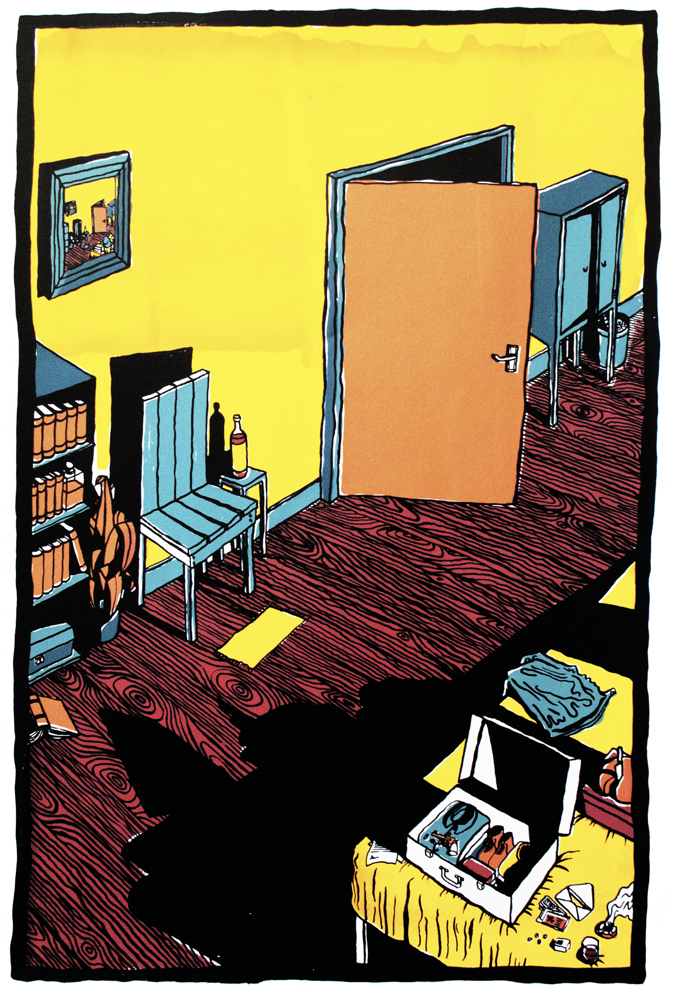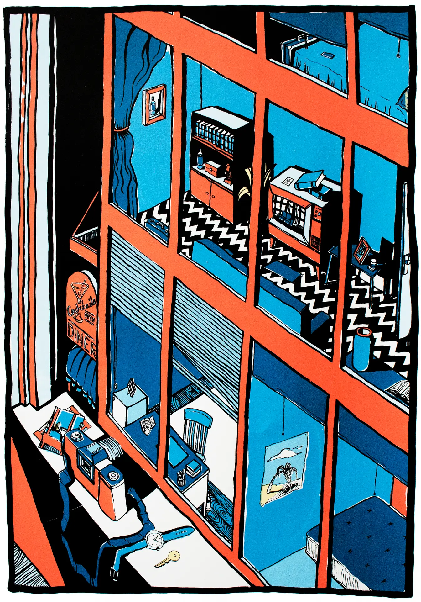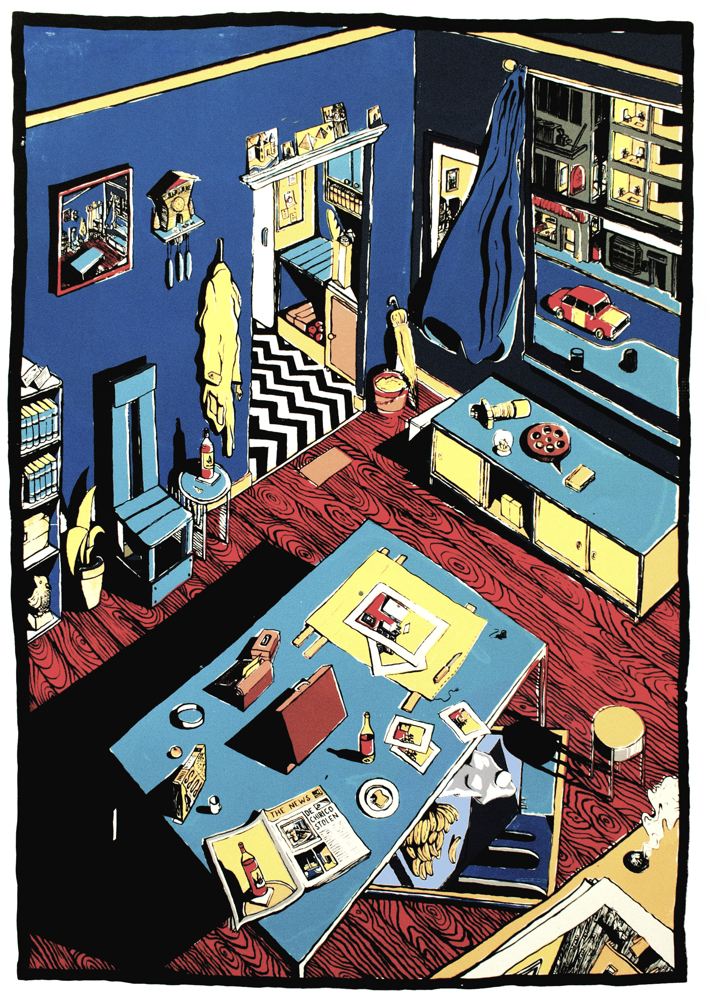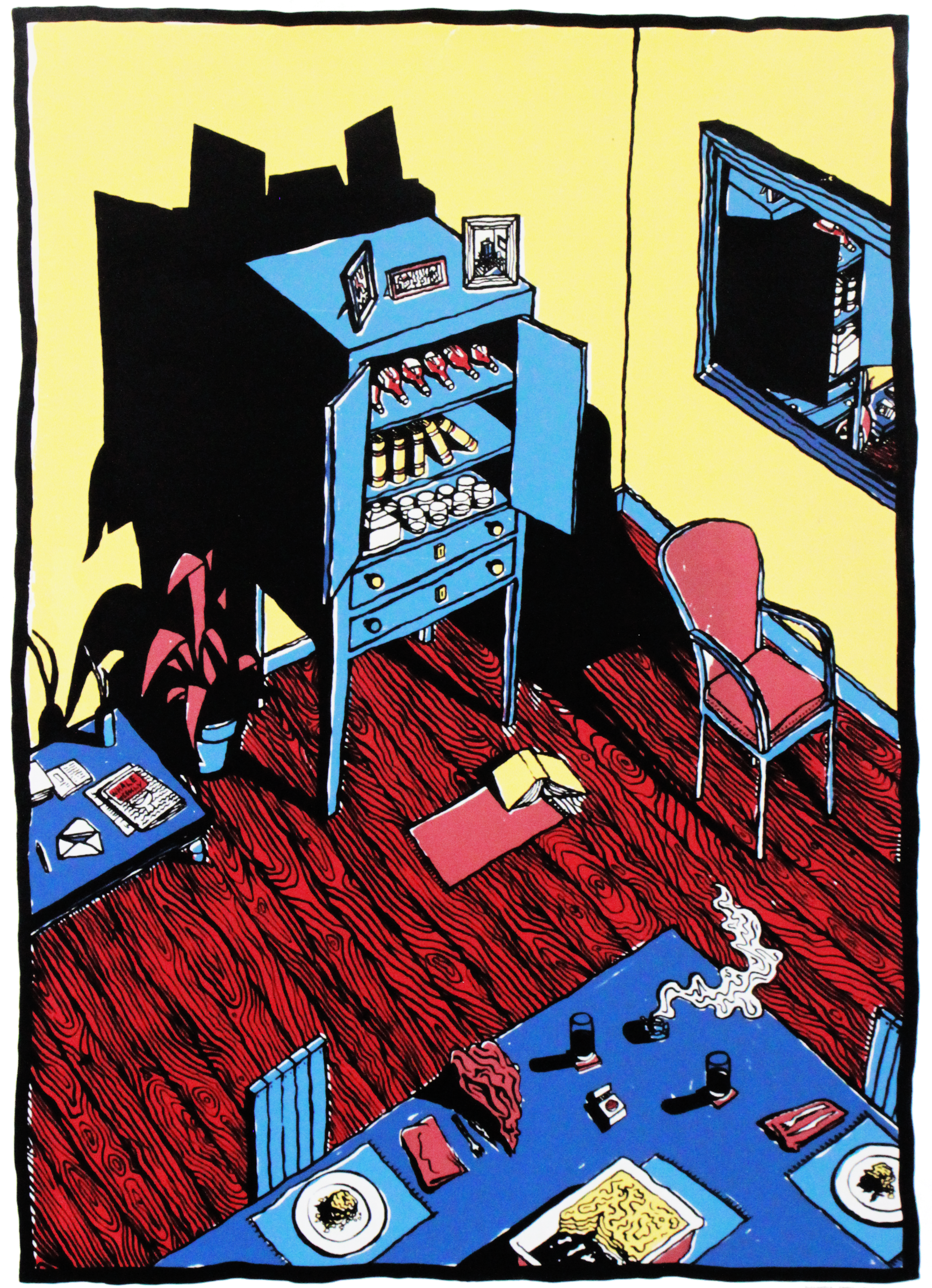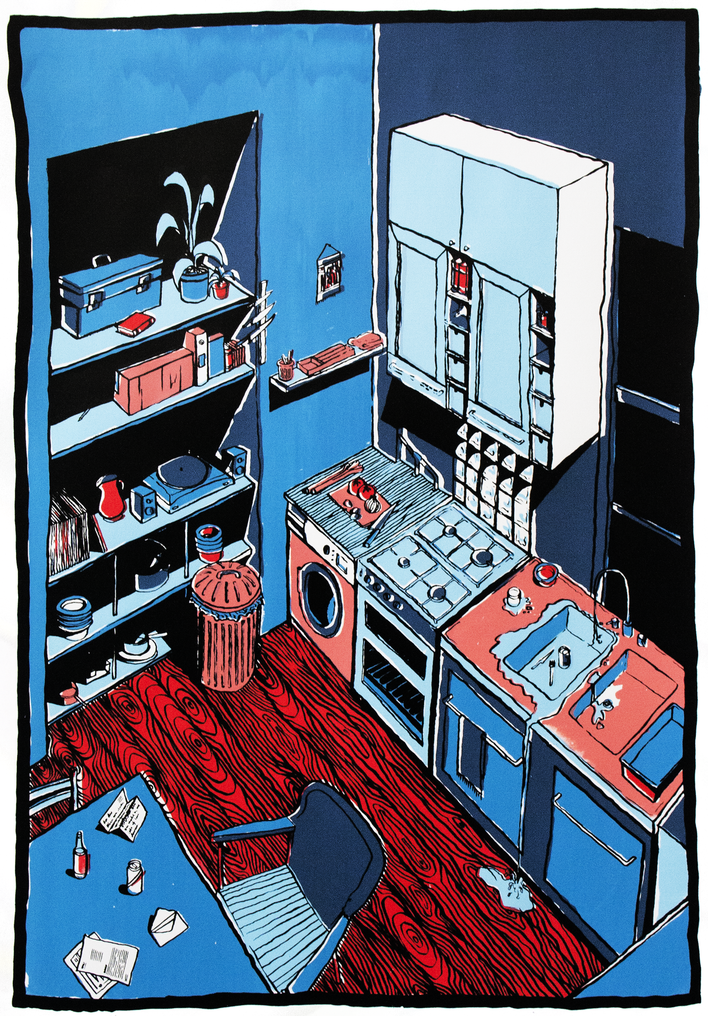 The successful use of bold black line almost creates a structure and grid form in which Alex perfectly fills with colour to accurately depict the theme and mood of each setting. Matching up an intricate six or seven colour screen print isn’t the easiest things to do at a normal scale, so considering the images are A1 and A0, Alex pulls off an almost impossible task although his images are not without the subtle off centred over laps of colour and line. However if anything this only adds to the grandness of his images and reminds the audience of the labour intensive method of how they were printed.
