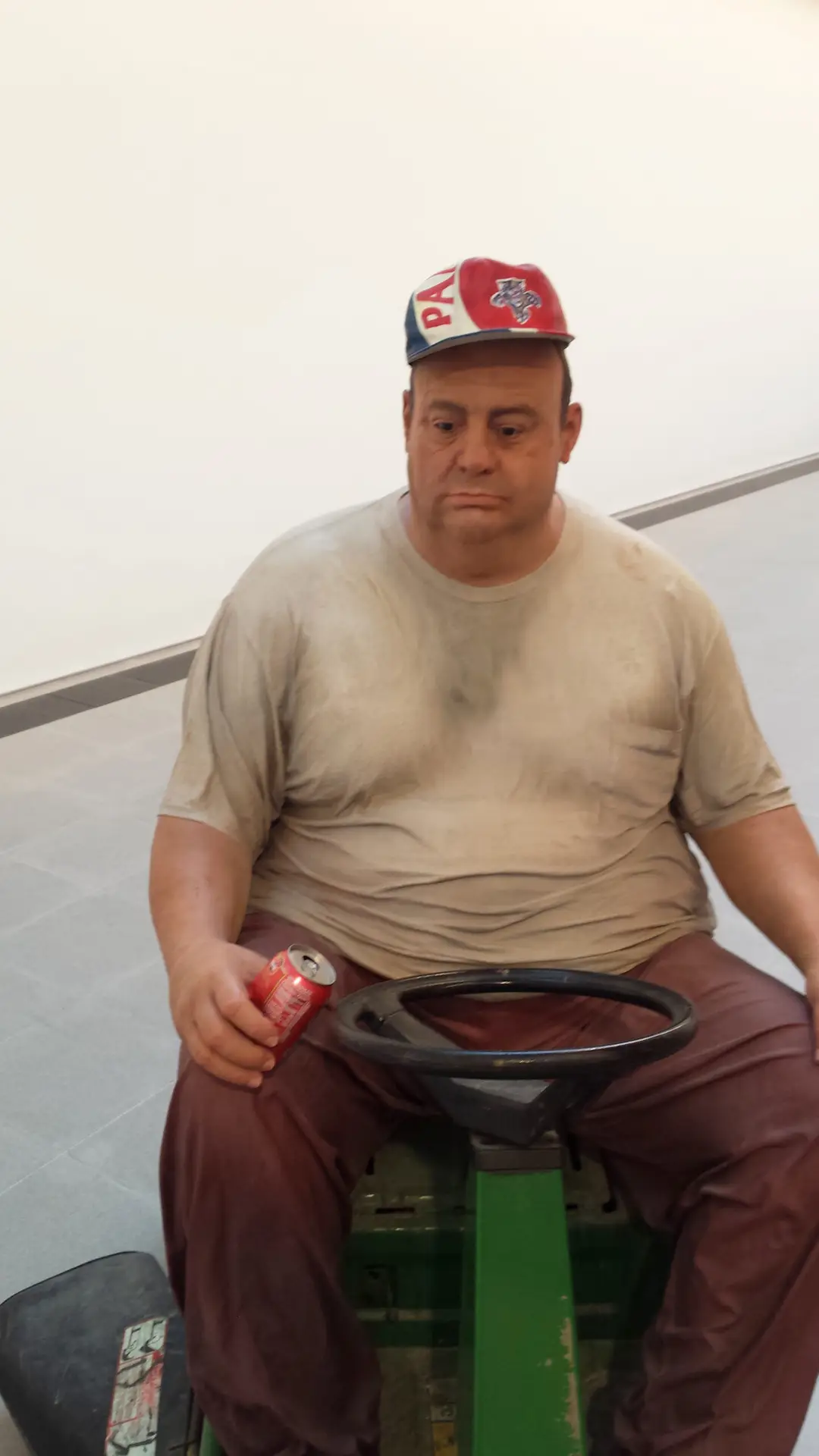The gallery situated in Hyde Park is currently hosting the works of American artist Duane Hanson, a sculptor in the mid 1960’s who spent his 40 year long career creating life like figures based on working class Americans. Stumbling upon the show by accident one day after strolling through the park it completely stunned and excited me (kinda sad i know). The incredible amount of detail and finish to each figure was enough to put me on edge and create a high sense of uneasy-ness throughout my time there. Each time i got close to one of the works of art to inspect its detailing, from a crooked yellowing tooth down to the raised veins on the hand, i couldn’t relax. The figures were so finely detailed that often i mistook another tourist or member of gallery staff for a work of art convincing myself that at least one of them had to be a real person and it was a sick joke being played on unsuspecting art lovers.