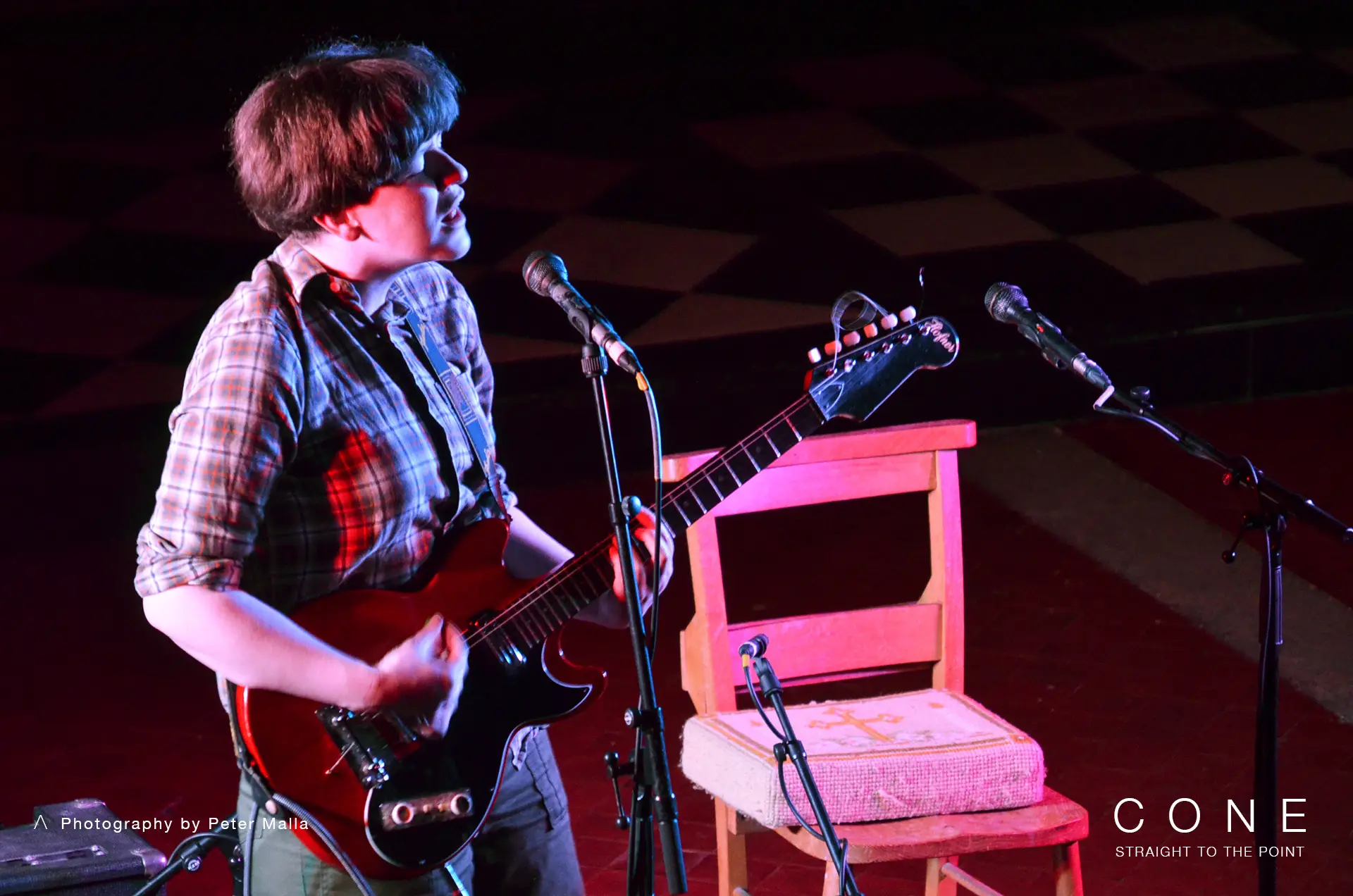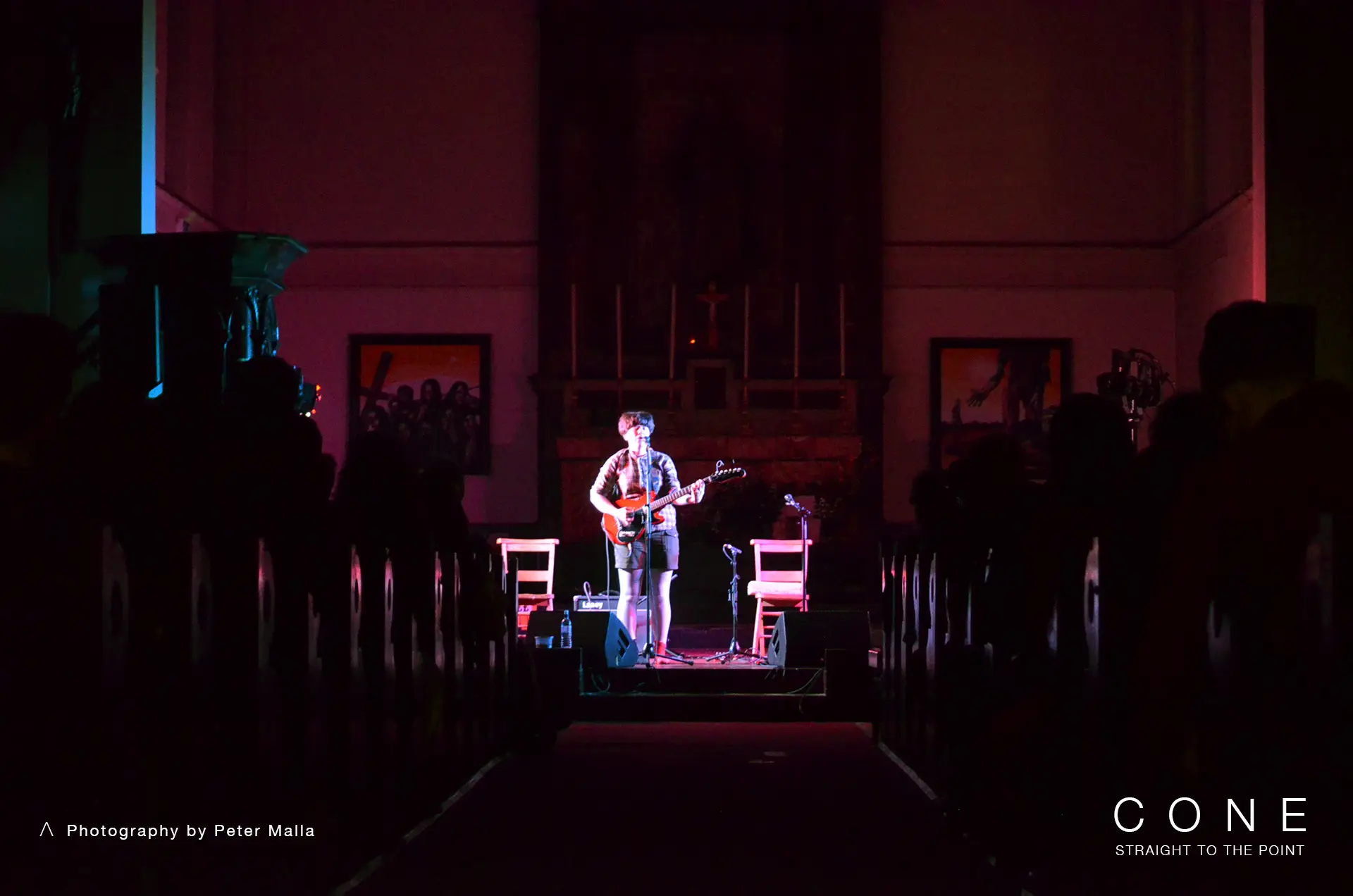 The starting slot saw Bristol’s Two White Cranes take on the stage single-handedly. Manned with just one guitar and a voice, her minimal pop-punk compositions completely engulfed the room with natural reverb and power. “Wow, everything sounds better in a church,’ she laughed, after belting out her first number. Even after breaking a string, she was modest and friendly with the attentive crowd, filling the 30 minutes with personal-diary-style tunes that were soft but punchy and raw. Perhaps more upbeat than her successor, Two White Cranes presented an interesting social commentary on love and anecdotal experiences.